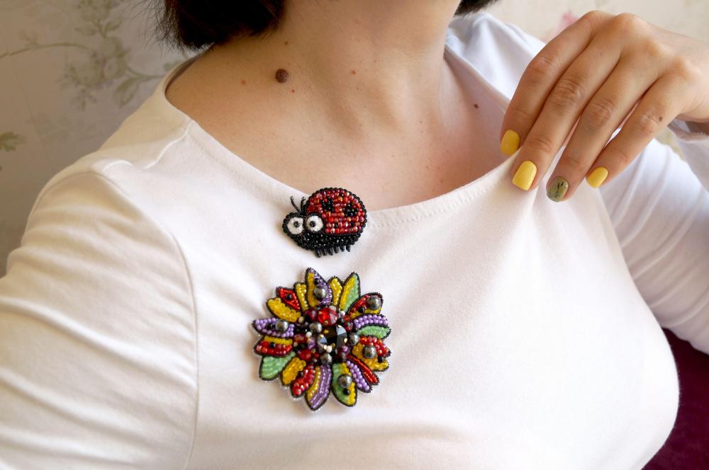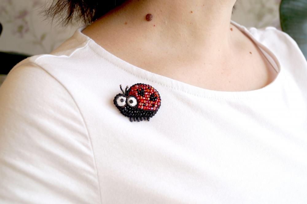 Авторская брошка "Божья коровка". Пятнышки на ней выполнены в виде сердечек. Принято считать, раз божья коровка села на вас, то это обязательно к чему-то хорошему. А божья коровка с сердечками вместо пятен - еще и к большой любви!